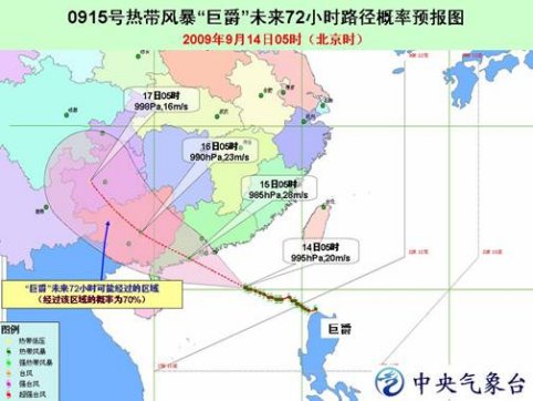 預計,風暴中心將以每小時25公里左右的速度向西偏北方向移動,逐漸向廣東中西部一帶沿?拷瑥姸戎饾u加強,并將于14日夜間到15日上午在廣東珠海到湛江一帶沿海登陸。
