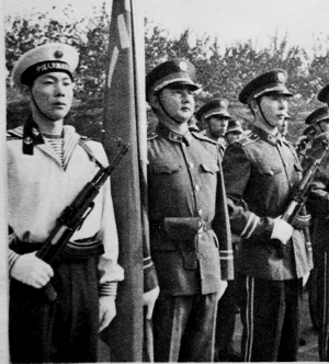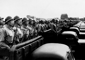 1950年1月,中央軍委批準全軍實行統(tǒng)一的新軍服方案,簡稱50式軍服。10月1日,陸?杖姴筷犞50式軍服受閱。受閱陸軍著黃綠色服裝,空軍著上黃綠下藏藍色服裝,海軍著白色服裝。陸海空三軍佩戴統(tǒng)一制式的帽徽和胸章,整齊劃一,面貌一新。新中國成立后人民解放軍第一次有了統(tǒng)一制式、統(tǒng)一標準的軍服。