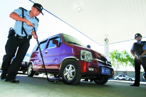 車子駛入檢查站后,絕大多數(shù)司機會立即遞出駕照、行駛本和身份證。如果車輛和人員沒有任何可疑之處,檢查時間極為短暫。如民警認為必要,會要求司機下車,打開后備箱,或者使用手持安檢儀、身份證識別儀、車底檢查鏡,對車輛和人員進行較細致的檢查!鞍讖R檢查站每天可檢查17000輛車,6萬多人!睓z查站站長齊躍警官告訴記者,當發(fā)現(xiàn)有可疑車輛,民警會要求該車駛出車道,在旁邊空場上檢查。發(fā)現(xiàn)可疑人員或需要重點檢查的人員之后,會將他們帶入候檢大廳,使用大廳里的安檢門、X光機等設備進行檢查。