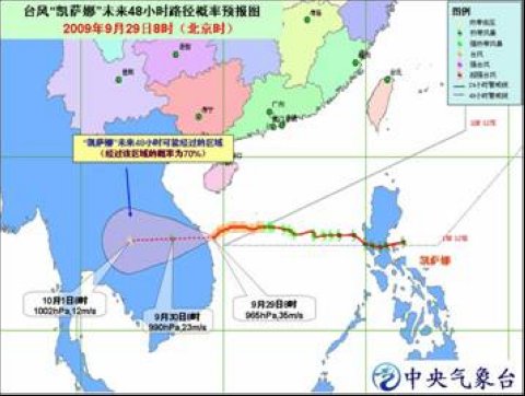 “凱薩娜”的中心29日10時位于越南廣義省以東大約40公里的南海西部海面上,就是北緯15.4度、東經(jīng)109.2度,中心附近最大風(fēng)力有12級(35米/秒),中心最低氣壓為965百帕。