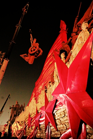 昨夜,天津彩車的工作人員正在進行拆解作業(yè),旁邊北京彩車的拆解即將開始。昨晚22時許,天安門廣場,60輛彩車的燈光依次熄滅,游人漸散。彩車轉(zhuǎn)場工作全面啟動。至今晨5時,國慶60周年群眾游行中的60輛彩車將全部轉(zhuǎn)移到朝陽體育中心。相關(guān)負責(zé)人介紹說,其中33輛彩車將返回原省份。本報記者 周曉東 攝