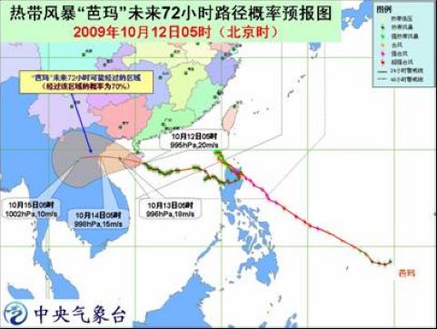 受“芭瑪”和冷空氣的共同影響, 12 日白天到夜間,東海南部、臺灣海峽、巴士海峽、巴林塘海峽、南海中北部海域、瓊州海峽、北部灣、海南沿海、廣東沿海以及福建沿海、浙江中南部沿海將有 5-7 級大風(fēng),部分海域或地區(qū)陣風(fēng)可達(dá) 8-9 級;“芭瑪”中心經(jīng)過的附近海域或地區(qū)的風(fēng)力有 8 級,陣風(fēng)可達(dá) 9-10 級,海南大部和廣東西南部沿海將有大到暴雨,其中海南東部的部分地區(qū)有大暴雨。