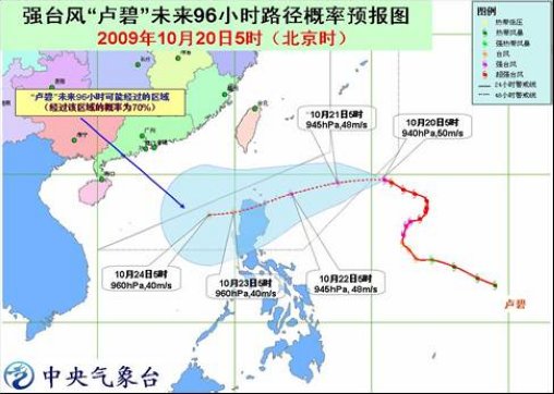 中新網(wǎng)10月20日電 中央氣象臺(tái)20日6時(shí)發(fā)布臺(tái)風(fēng)預(yù)報(bào):強(qiáng)臺(tái)風(fēng)“盧碧”將以每小時(shí)20公里左右的速度先向偏西方向移動(dòng),以后將轉(zhuǎn)向西偏南方向移動(dòng),逐漸向菲律賓呂宋島東北部沿?拷,強(qiáng)度緩慢減弱。