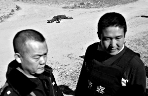 昨日在和林格爾縣舍崖鄉(xiāng)鄉(xiāng)政府附近的一個(gè)丁字路口,一輛農(nóng)用三輪車側(cè)翻在路口旁的溝底里。在距離農(nóng)用三輪車幾百米的空地上,躺著越獄犯高博的尸體。他穿著灰色上衣,藍(lán)色褲子,仰面朝天躺在地上,臉上沾滿了血跡。