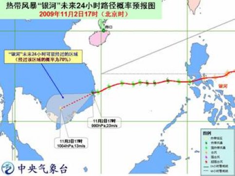 中新網(wǎng)11月2日電 中央氣象臺2日18時發(fā)布臺風(fēng)預(yù)報:今年第21號強熱帶風(fēng)暴“銀河”的中心已于2日16時前后在越南富安省(PhuYen)與慶和省(KhanhHoa)交界附近沿海登陸,登陸時中心附近最大風(fēng)力有10級(25米/秒),中心最低氣壓為985百帕。登陸后,“銀河”減弱為熱帶風(fēng)暴,17時其中心位于越南慶和省境內(nèi),就是北緯12.8度、東經(jīng)109.1度,中心附近最大風(fēng)力有9級(23米/秒),中心最低氣壓為990百帕。