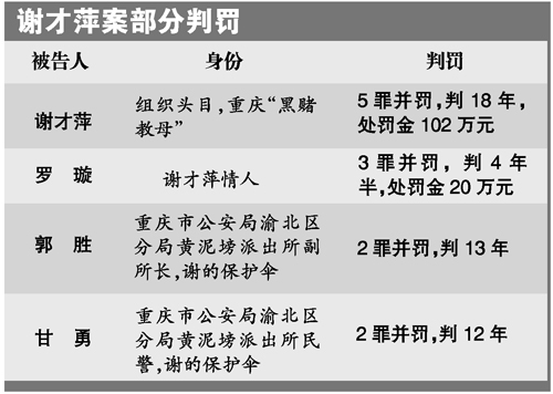 昨天上午,重慶市第五中級人民法院對謝才萍等22人“涉黑”案一審公開宣判。謝才萍犯組織、領(lǐng)導(dǎo)黑社會性質(zhì)組織罪、開設(shè)賭場罪等罪被判處有期徒刑18年,其余21名被告人分別被判處1至13年不等的有期徒刑。