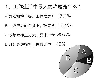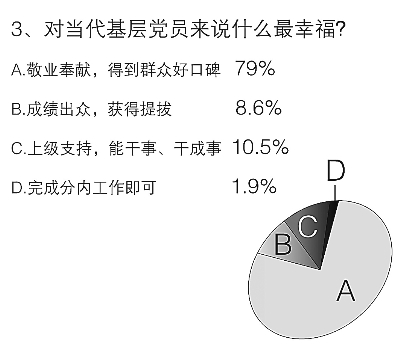 對當代基層黨員干部來說,在事業(yè)上什么是最幸福的?根據(jù)調(diào)查,79%的受訪者選擇了“敬業(yè)奉獻,得到群眾好口碑”,這說明在基層,群眾工作是最重要的方面。也有10.5%的干部更希望得到“上級支持,有一個‘能干事,干成事’的氛圍”。