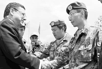 當(dāng)?shù)貢r(shí)間昨天中午,中國(guó)第十批赴剛果(金)維和醫(yī)療、工兵分隊(duì)聯(lián)合舉行盛大儀式接受聯(lián)剛團(tuán)授勛。聯(lián)剛團(tuán)最高官員、聯(lián)合國(guó)秘書長(zhǎng)潘基文特別代表阿蘭多斯專程從金沙薩趕到布卡武的中國(guó)半島,親手為中國(guó)維和官兵頒授聯(lián)合國(guó)和平勛章。據(jù)悉,這種聯(lián)剛團(tuán)最高規(guī)格的授勛儀式,在布卡武任務(wù)區(qū)各國(guó)維和分隊(duì)中尚屬首次。中國(guó)駐剛果(金)大使吳澤獻(xiàn)和武官畢京三也從剛果(金)首都趕來(lái)參加這一儀式。