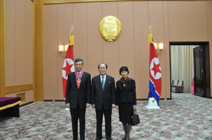 劉曉明大使夫人胡平華及中國(guó)駐朝鮮使館外交官、朝鮮最高人民會(huì)議常任委員會(huì)對(duì)外事業(yè)部長(zhǎng)林賢輔,外務(wù)省副相金亨俊等參加授勛儀式。