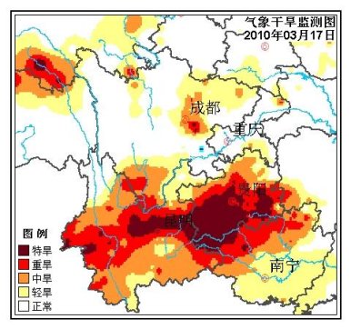 中新網(wǎng)3月17日電 中央氣象臺(tái)3月17日繼續(xù)發(fā)布干旱黃色預(yù)警:根據(jù)3月17日監(jiān)測(cè),云南大部、貴州中部和西南部、川西高原南部和廣西西北部等地維持氣象干旱重旱等級(jí)。18日,云南西北部、廣西東部有小陣雨,未來(lái)三天,其余旱區(qū)無(wú)降水。云南大部、貴州大部、川西高原南部、廣西西北部等地的氣象干旱將持續(xù)或發(fā)展。