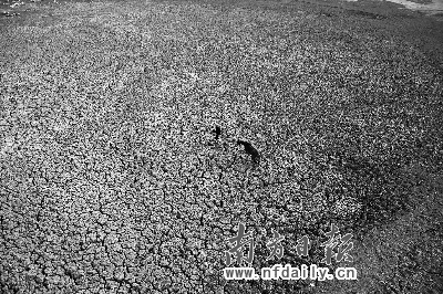 陸良縣德格海子水庫庫容160萬立方米,由于持續(xù)干旱已干涸見底。20日下午,溫家寶曾來過這里。記者現(xiàn)場放眼望去,水庫庫底一條條縱橫交錯的裂痕一望無垠,近看密密麻麻的泥塊像梅花樁一樣,裂痕深度足有二十厘米,上面還依稀可見干枯死的河蚌。