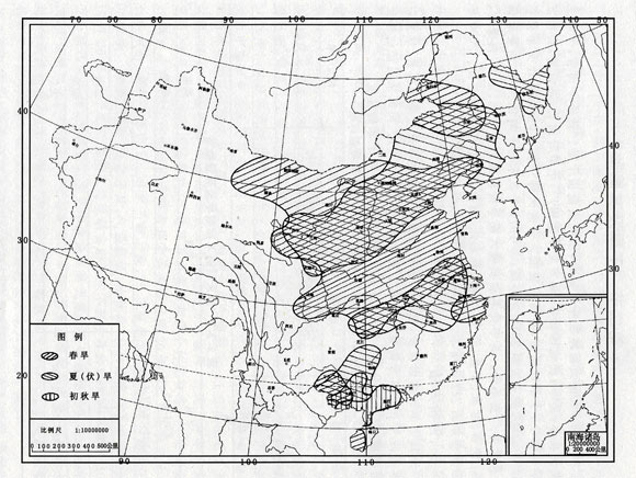 2000年,我國(guó)大部地區(qū)降水偏少,出現(xiàn)大范圍干旱。就季節(jié)而言,干旱主要發(fā)生在春、夏季;就地區(qū)而言,北方受旱范圍廣,干旱時(shí)間長(zhǎng),旱情重,而南方受旱范圍小,干旱時(shí)間短,旱情也較輕。據(jù)有關(guān)部門統(tǒng)計(jì),全國(guó)累計(jì)受旱面積4054萬(wàn)公頃,成災(zāi)面積2678萬(wàn)公頃,與1971年以來(lái)-的平均值相比,均顯著偏多,屬干旱嚴(yán)重年份。其中受旱面積較大或旱情較重的有河北、山西、內(nèi)蒙古、山東、陜西、甘肅、寧夏、遼寧、吉林、黑龍江、湖北、安徽、江西等省區(qū)。
