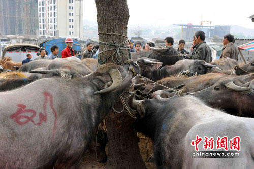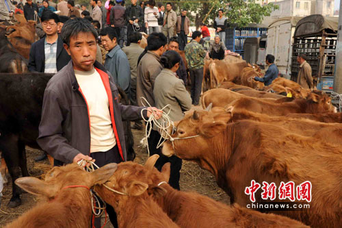 秦大章夫婦看上了馮元達(dá)一頭不到兩歲的小牛,“沒換牙齒、蹄也不錯(cuò)!鼻卮笳潞軆(nèi)行的告訴記者。在此后近30分鐘的時(shí)間里,一場在2300元至1900元人民幣之間的價(jià)錢拉鋸戰(zhàn)進(jìn)行起來。最終,在周邊人的撮合下,秦大章以2010元的價(jià)錢買到了他看上的小牛。