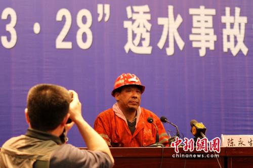 中新網(wǎng)4月5日電 記者張雷杰山西王家?guī)X礦救援現(xiàn)場連線報(bào)道:4月5日下午15點(diǎn)45分,王家?guī)X煤礦透水事故搶險(xiǎn)救援指揮部召開第十次新聞發(fā)布會。新聞發(fā)言人劉德政表示,截止到目前,153名被困井下工人中115人獲救。參與第一批救援的山西焦煤集團(tuán)汾西礦業(yè)救援大隊(duì)的大隊(duì)長陳永生還首次披露了被困礦工在地下生存九天之謎:吃松樹皮,喝井下涼水。