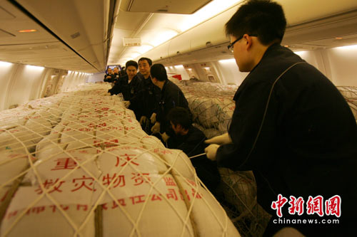 截至15日17時,中共重慶市委、市政府組織的第二批救災物資已經(jīng)運抵重慶機場,由國航重慶分公司的波音737-800執(zhí)行飛行任務準備運往災區(qū)。而重慶機場已在下午開始對首批救援物資進行裝載,包括1萬床棉被、2500件棉大衣、3130件防寒服、500件兒童羽絨服、20件應急燈和160臺發(fā)電機等。完