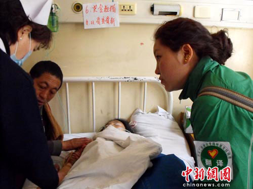 在來自玉樹縣的33歲的央金拉措床前,西北民族大學(xué)2009級(jí)藏語言文學(xué)自考班的學(xué)生更求拉吉,自15日晚起,成為“救治青海地震災(zāi)區(qū)傷員翻譯”志愿者,她跑前跑后的為傷者服務(wù),央金拉措的哥哥用簡(jiǎn)單的漢語對(duì)記者連聲說,好、好!記者通過更求拉吉了解到,央金拉措他們來自于牧區(qū)很少去醫(yī)院,昨晚一住進(jìn)醫(yī)院后就暈頭轉(zhuǎn)向了,幸虧有大學(xué)生志愿者為他們提供幫助。(完)