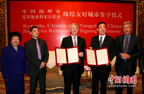 中新網(wǎng)揚(yáng)州4月17日電(記者 崔佳明)16日,克羅地亞科爾丘拉市副市長弗蘭克•斯蒂奈克率團(tuán)訪問揚(yáng)州,當(dāng)晚,揚(yáng)州市副市長聞道才和弗蘭克•斯蒂奈克副市長在揚(yáng)州迎賓館分別代表兩市簽訂協(xié)議,雙方正式締結(jié)為友好城市。