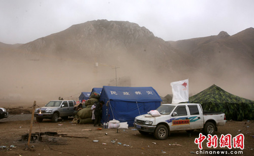 中新網青海玉樹4月19日電(記者劉忠俊)19日14:36分,青海玉樹地震災區(qū)天氣突變,由晴天轉變?yōu)殛幪,現(xiàn)場掛起了大風,天空撒起了雨點。