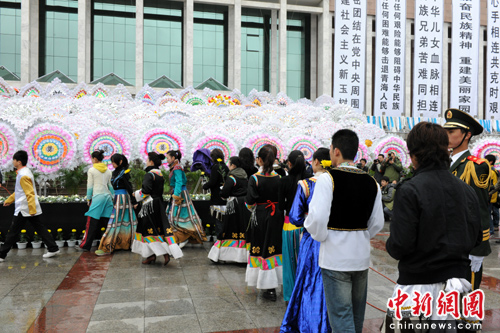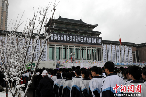 儀式在西寧最大的廣場新寧廣場舉行,在青海省博物館大樓上,高高懸掛著黑底白字橫幅“青海各族群眾深切哀悼玉樹遇難同胞”,橫幅下方的臺階上擺滿了花圈,一條條潔白的哈達(dá)懸掛在欄桿上。