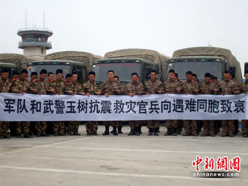 中新網(wǎng)4月21日電(劉洪星)今日,玉樹(shù)災(zāi)區(qū)巴塘機(jī)場(chǎng)武警青?傟(duì)第四支隊(duì)全體官兵、全體解放軍部隊(duì)、醫(yī)療單位、機(jī)場(chǎng)工作人員以及其他救援人員在候機(jī)樓前停車場(chǎng)舉行三分鐘默哀活動(dòng),現(xiàn)場(chǎng)降半旗,所有人員駐足默哀、所有車輛鳴笛、防空警報(bào)響起。同時(shí)玉樹(shù)州所有救援部隊(duì)、救援單位、各級(jí)人員同期舉行為地震死難人員默哀活動(dòng)。