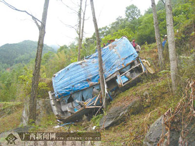 東蘭訊 4月22日上午9時許,一輛由大化瑤族自治縣七百弄鄉(xiāng)開往河池市的客運(yùn)中巴車,在途經(jīng)東蘭縣花香鄉(xiāng)干來村時突發(fā)機(jī)械故障,導(dǎo)致車輛滾下90米長陡坡(垂直高度40米)。事故造成車上7名乘客先后死亡,35人不同程度受傷。
