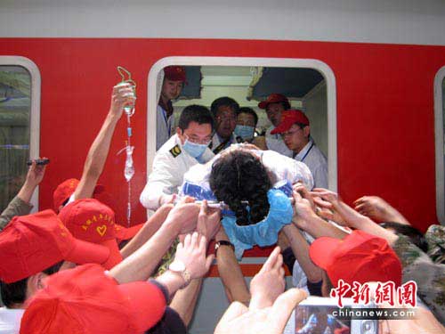 隨后,在“小心!小心!平移!平移!”的聲音中,鐵路人和醫(yī)務(wù)人員將病人放上擔(dān)架,并輕輕從窗口遞出,窗外每輛擔(dān)架車兩邊分別等候著的5名志愿者和4名醫(yī)護(hù)人員,也是格外小心的輕舉著從窗口傳出的傷員。