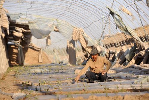 記者在恰特喀勒鄉(xiāng)設(shè)施農(nóng)業(yè)基地看到,大棚遭到大風(fēng)不同程度的毀壞,棚頂?shù)乃芰媳∧と勘淮箫L(fēng)吹爛,大棚內(nèi)的西紅柿、茄子等蔬菜被風(fēng)沙侵襲后干枯,一些已經(jīng)掛果的蔬菜也大面積枯死。