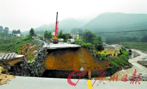 本報韶關(guān)訊(記者卜瑜 通訊員賴志坡、蔡明清攝影報道) 位于乳源境內(nèi)的國道323線K426+360處大型涵洞被洪水沖毀。路面出現(xiàn)深達(dá)14.5米的大洞(如圖),被毀路基長90米、路面面積1000平方米,交通中斷。韶關(guān)市政府昨天調(diào)集100多名工人和10多臺大型機械日夜搶修,有望今天恢復(fù)通行。
