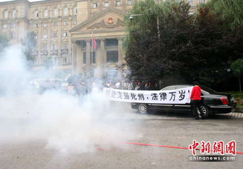 宣判結(jié)果宣布不久,數(shù)十名普通百姓在重慶高級(jí)人民法院拉起“判處文強(qiáng)死刑,法律萬(wàn)歲”的橫幅,并放起鞭炮以示慶祝。