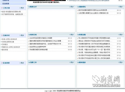 記者隨即登錄武漢市發(fā)改委政務(wù)公開網(wǎng)站。在該網(wǎng)站首頁記者發(fā)現(xiàn),除“來信選登”一欄開天窗以外,其它欄目的信息更新還比較及時?僧(dāng)記者點(diǎn)擊進(jìn)入子欄目時,就不是那么回事了!俺R妴栴}匯總”、“表格下載”、“項(xiàng)目稽查”、“財(cái)政公開”等十幾個子欄目,均無任何內(nèi)容,只有大片空白。此外,在市民具體辦事的“業(yè)務(wù)專欄”欄目下,24個子欄目內(nèi)容驚人地一致,幾乎全是空白框架。