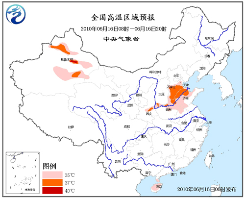 預(yù)計(jì),今天白天,河北南部、天津西南部、山西西南部、河南北部、山東北部和西部、安徽北部、陜西關(guān)中地區(qū)以及廣東雷州半島、海南大部將有35~37℃的高溫天氣,其中,河北南部部分地區(qū)的最高溫度可達(dá)38℃;新疆北疆盆地以及南疆盆地將有35℃以上的高溫天氣,其中,吐魯番盆地最高氣溫可達(dá)40~43℃。