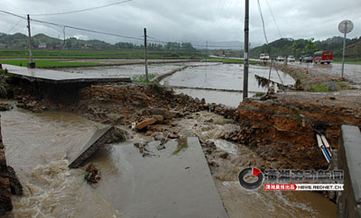 該路毀壞最嚴重的地方位于李熙橋段,因山體滑坡,路基被水沖空。在該路段的兩端,均設有“水毀道路,繞道行車”的指示牌。