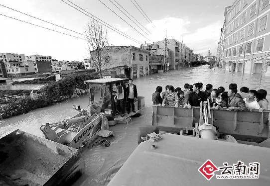 大水淹沒馬龍縣城的主街道之后,要進入城區(qū),又高又大的裝載機成了唯一的交通工具,也成了輪渡公交,城里地勢較高的地方成了碼頭。坐上這些裝載機,災民們從城內(nèi)紛紛撤了出來……昨天,副省長孔垂柱到達馬龍考察災情時,同樣是站在了裝載機上。而本報記者也一同爬上裝載機,一路進入城區(qū)。