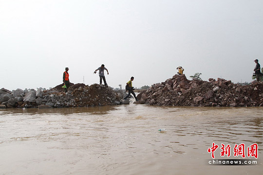 下午4點(diǎn)左右,數(shù)米長的小口子,已經(jīng)被接連倒下的七八卡車石料填成數(shù)十厘米寬的“裂縫”,由于大壩堤外水位比撫河水位高,洪水從堤外往河內(nèi)倒流,剩下的最后“裂痕”就像一條涓涓細(xì)流,不少人在上面來回走動(dòng),幾天來難以跨越的決口,終于連在了一起。