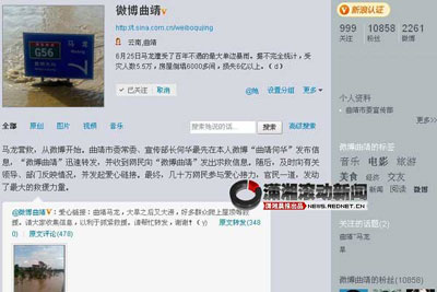 25日晚,云南省曲靖市馬龍縣遭遇特大暴雨,26日中午起,曲靖市委宣傳部部長(zhǎng)何華的個(gè)人微博及宣傳部官方微博——“微博曲靖”開(kāi)始圖文直播馬龍災(zāi)情與救災(zāi)情況,在馬龍縣城電力、交通、通訊中斷幾成“孤島”的情況下,曲靖官方微博成為網(wǎng)友獲取第一手信息的來(lái)源。