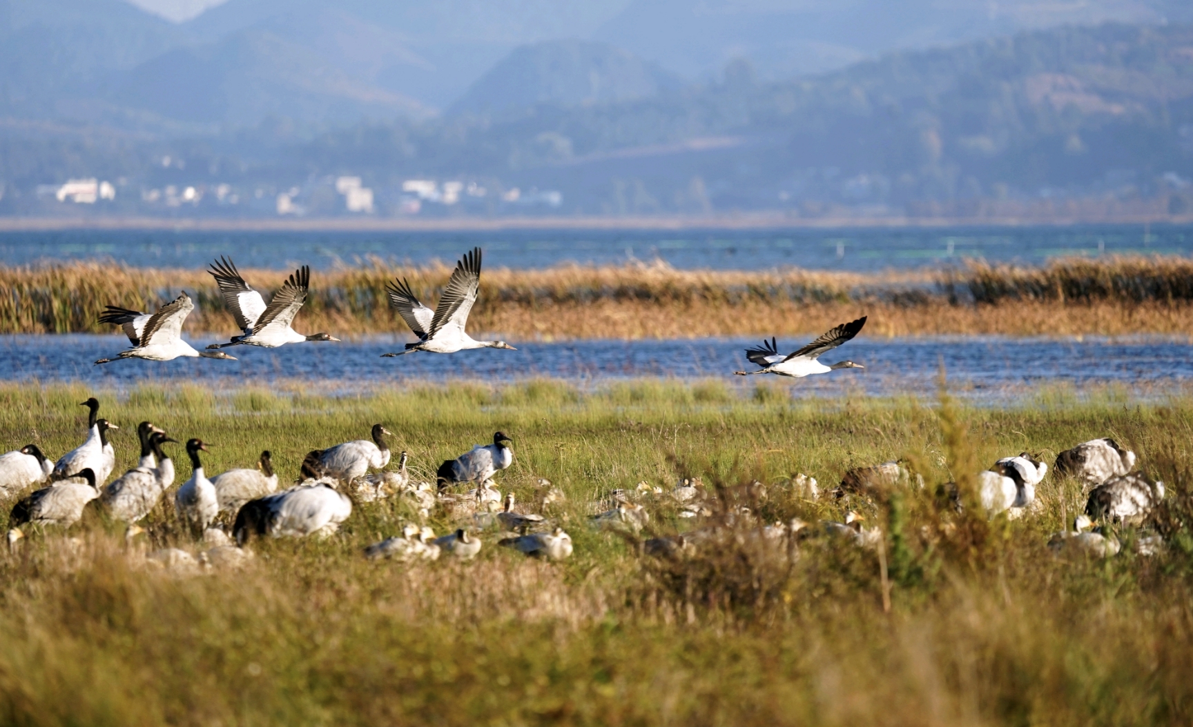 鶴鳴九皋,聲聞?dòng)谝?。進(jìn)入11月,貴州高原最大的淡水湖泊——草海陸續(xù)迎來(lái)“高原仙子”黑頸鶴到此越冬。