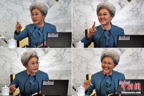 3月4日,大會(huì)發(fā)言人傅瑩就大會(huì)議程和人大工作相關(guān)問(wèn)題回答中外記者的提問(wèn)。(拼版圖片) 中新社記者 金碩 攝