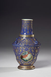 清乾隆磁胎洋彩青地金花魚游春水瓶