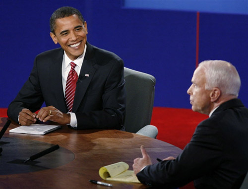 美國共和黨總統(tǒng)候選人麥凱恩和民主黨總統(tǒng)候選人奧巴馬于美東時間15日晚上9時(北京時間16日早上9時)在紐約霍夫斯特拉大學(xué)展開總統(tǒng)選舉投票前的最后一場電視辯論。雙方坐在同一張桌子前就各自的經(jīng)濟(jì)計劃展開唇槍舌戰(zhàn)。