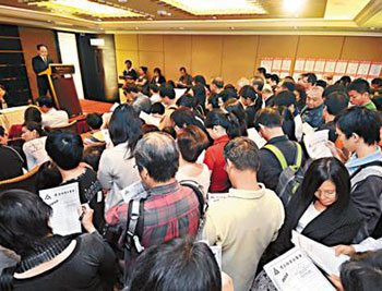 25日舉行的一場以銀主盤為主的拍賣場,即吸引接近150人到場準(zhǔn)備“買便宜樓”,不但逼爆整個會場,遲到的準(zhǔn)買家更不惜在會場門口人群中突圍舉手爭逐,部分單位就出現(xiàn)數(shù)名準(zhǔn)買家,經(jīng)十多口價(jià)才奪得心頭好的現(xiàn)象。