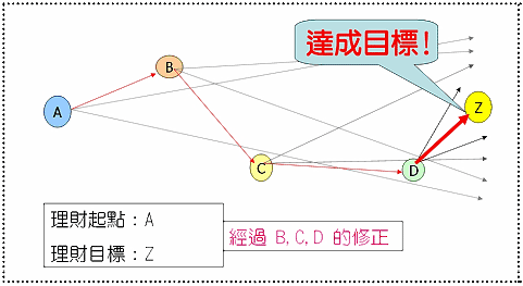 經(jīng)過一段時間,理財階段來到了C點,似乎又偏離了當初既定的方向。就又是“適時調(diào)整”的時候,所以重新找出新方向,即從C點至Z點的雙箭頭所涵蓋的范圍。在投資理財?shù)倪^程中,會不斷的重復B點、C點、D點等的修訂調(diào)整。