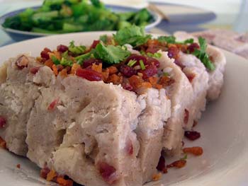 4、把香腸芋頭丁鋪一層在蛋糕模底層,再把打好的米漿搖晃均勻,倒在模具里,再在上面撒一層香腸芋頭;