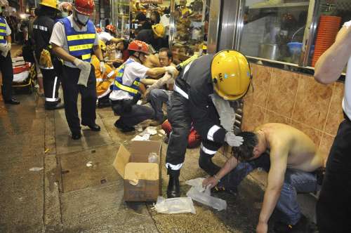事發(fā)昨晚七時四十五分左右,當時正下著大雨,有人在上址以兩個汽水膠樽盛鏹水掟落街,在一名內(nèi)地游客身旁跌落地,撞擊濺出的液體冒出白煙,在現(xiàn)場數(shù)十名游人誤為有人扔垃圾,惟隨即感到皮膚劇痛,才知“中招”,受驚紛紛狂叫,四散跑入附近的店鋪求助。職員實時扶傷者到安全地方,同時取清水讓各人清洗傷口。多輛救護車趕往救援,將傷者分送醫(yī)院。警方則動員逾二百人進行調(diào)查,現(xiàn)場通宵未能解封。
