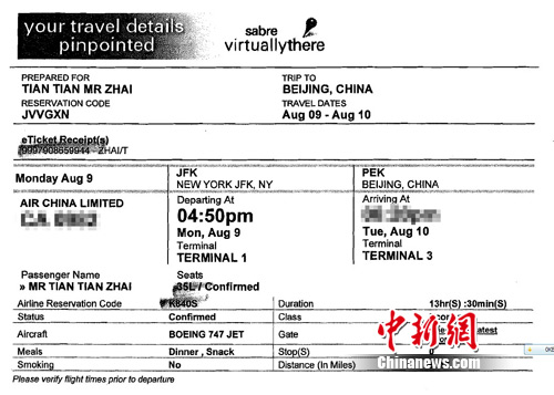 據(jù)了解,翟田田所乘坐的從紐約肯尼迪國際機(jī)場直飛中國北京的航班,將于10日下午抵達(dá)北京,屆時翟田田的親友將在北京接機(jī)。(完)