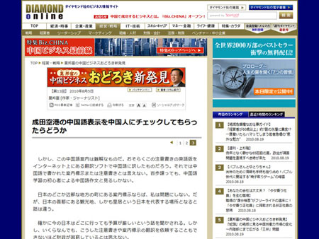 中新網(wǎng)8月20日電 據(jù)日本新華僑報網(wǎng)報道,今年7月1日,日本開始在此降低中國個人游入境門檻。顯然,日本民主黨執(zhí)政上臺后把“觀光立國”作為一個基本國策。但是,要迎接大量中國游客的到來,日本真的準(zhǔn)備好了嗎?近日,著名旅日華人作家莫邦富在日本主要經(jīng)濟(jì)周刊《鉆石》網(wǎng)站上連續(xù)撰文,指出日本的“國門”成田機(jī)場里,面向中國游客的一些中文標(biāo)識的翻譯十分粗糙,有些服務(wù)細(xì)節(jié)不如中國,工作人員在意識上還沒有完全做好接待中國游客的準(zhǔn)備。