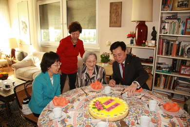 韓女士雖已年逾九十高齡,但精神矍鑠、談吐流利,依然時刻關(guān)注著中國的進步和發(fā)展。在交談中,她衷心感謝吳大使夫婦專程趕來洛桑為其慶生,表示,使館的惦記和關(guān)懷讓她感到無比溫馨。她祝祖國繁榮昌盛,人民幸福安康。