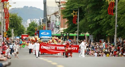 在醒目的“中華社區(qū)”英文橫幅后面,是幅面巨大的五星紅旗和新西蘭國旗。兩面旗幟都是3米寬5米長,合計面積達(dá)到30平方米,需要12個人共同擎舉,極為引人注目。華人隊伍聲勢浩大,鑼鼓喧天,紅旗招展,觀眾們看到隊伍過來,遠(yuǎn)遠(yuǎn)就開始熱情鼓掌歡迎,主持人還組織觀眾學(xué)著用中文齊聲高喊:“你好!”形成一股巨大的聲浪,向中華社區(qū)方陣致意,向基督城華人問好。