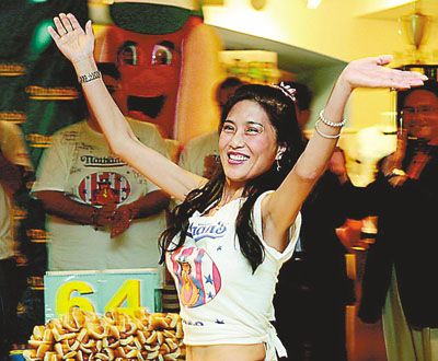 李蕙在競(jìng)吃場(chǎng)內(nèi)的知名度迅速提升。她在2007年第一次參加紐約國(guó)慶節(jié)吃熱狗大賽中,12分鐘內(nèi)吃掉26根熱狗,名列第十。去年,她則以10分鐘吃掉42根熱狗的成績(jī)向前沖,成為成績(jī)最佳女選手。今年7月4日她再次在熱狗大賽中亮相,吞下34根熱狗后表示今年只是量力而行,順利完成自己制定的個(gè)人目標(biāo)。