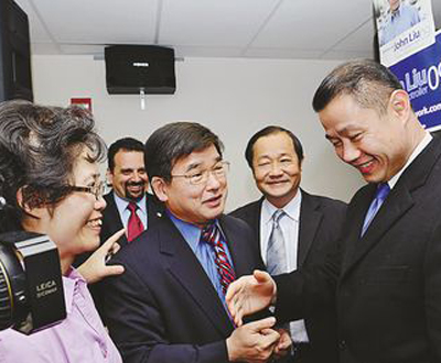 中新網(wǎng)11月6日電 據(jù)美國《世界日報》報道,忙于謝票的紐約第20選區(qū)現(xiàn)任市議員、候任市主計長華裔劉醇逸和候任華裔市議員顧雅明4日早上在華策會福壽老人中心喜相逢,兩人熱情擁抱,互相祝賀創(chuàng)造歷史,并表示兩人將馬上開始著手交接工作,使法拉盛民眾的服務(wù)不因為市議員的更替而中斷。