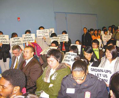 南費(fèi)城高中亞裔學(xué)生、家長(zhǎng)和華埠小區(qū)領(lǐng)袖百余人,9日下午手持“是誰(shuí)讓它發(fā)生”等抗議標(biāo)語(yǔ),游行至教育局參加公聽(tīng)會(huì),游行者高喊“停止學(xué)校暴力”、“給我安全教育環(huán)境”,抒發(fā)壓抑多時(shí)的不滿(mǎn)。